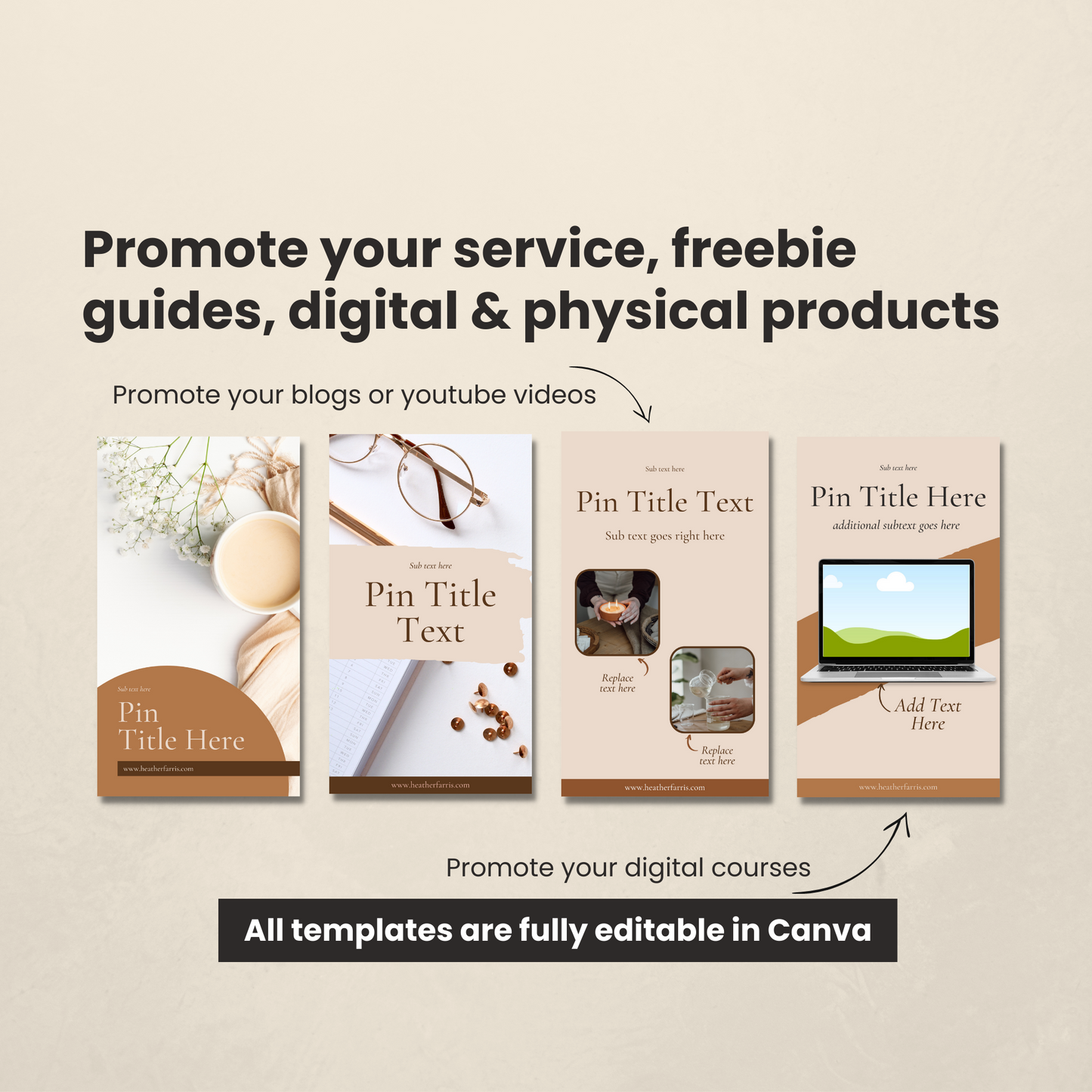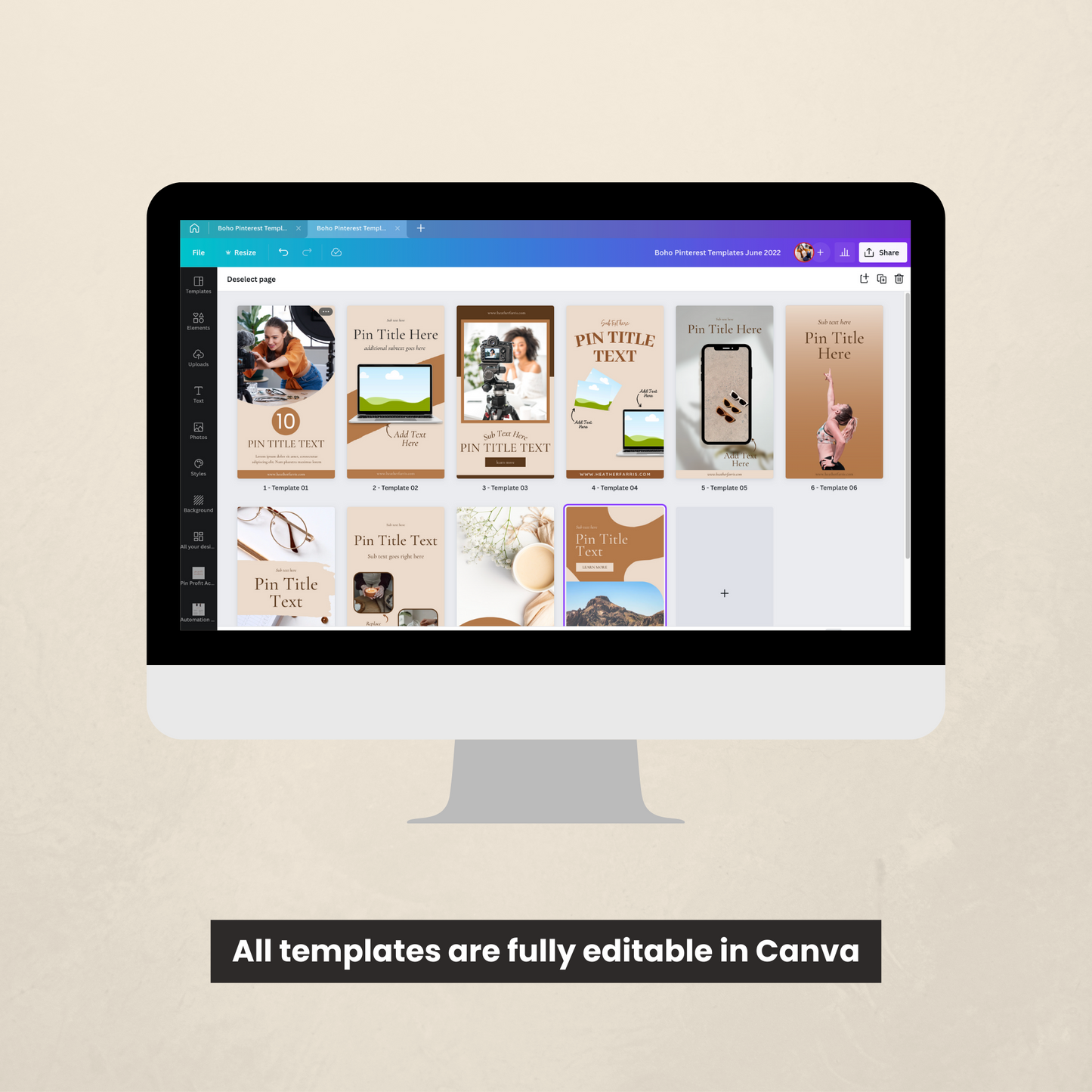 These boho themed Pinterest templates are ready to go. You can start creating pins on Pinterest in minutes.
