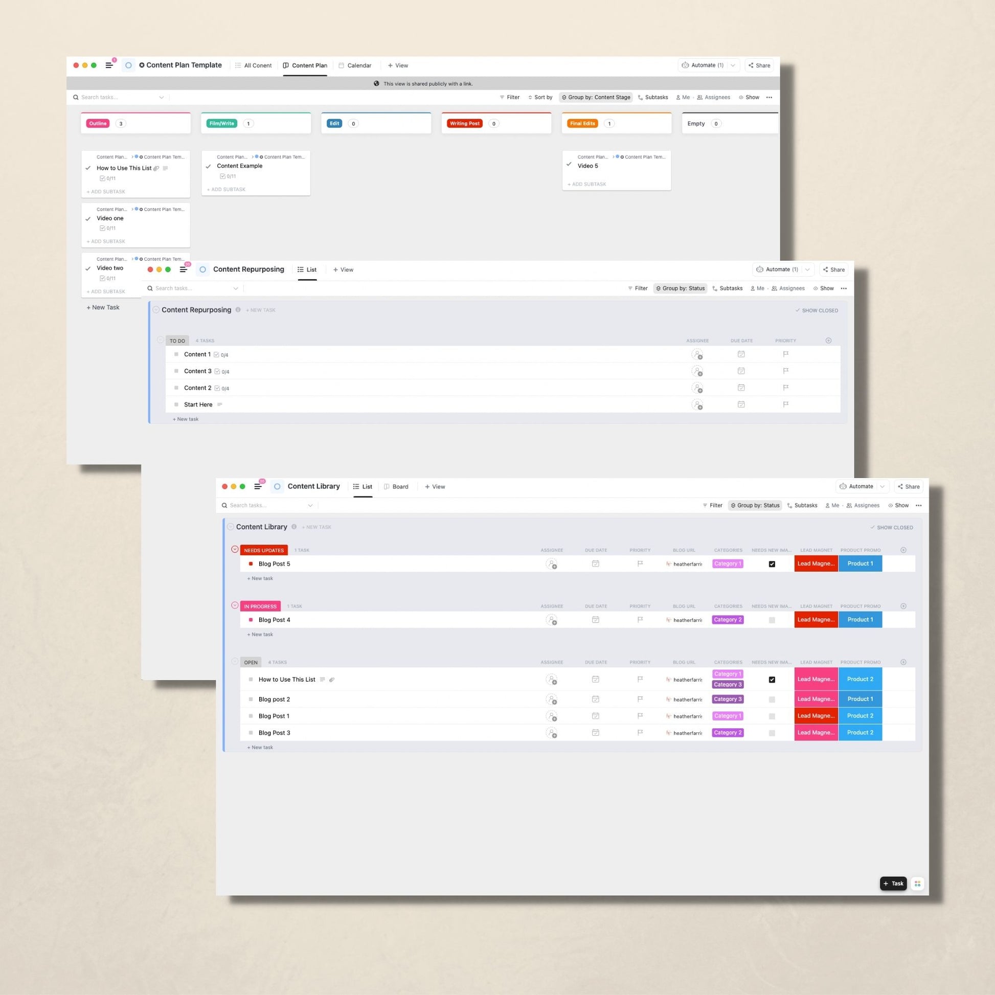 - How to maintain your content library aka your content management system in ClickUp so you always know what you have in your arsenal.