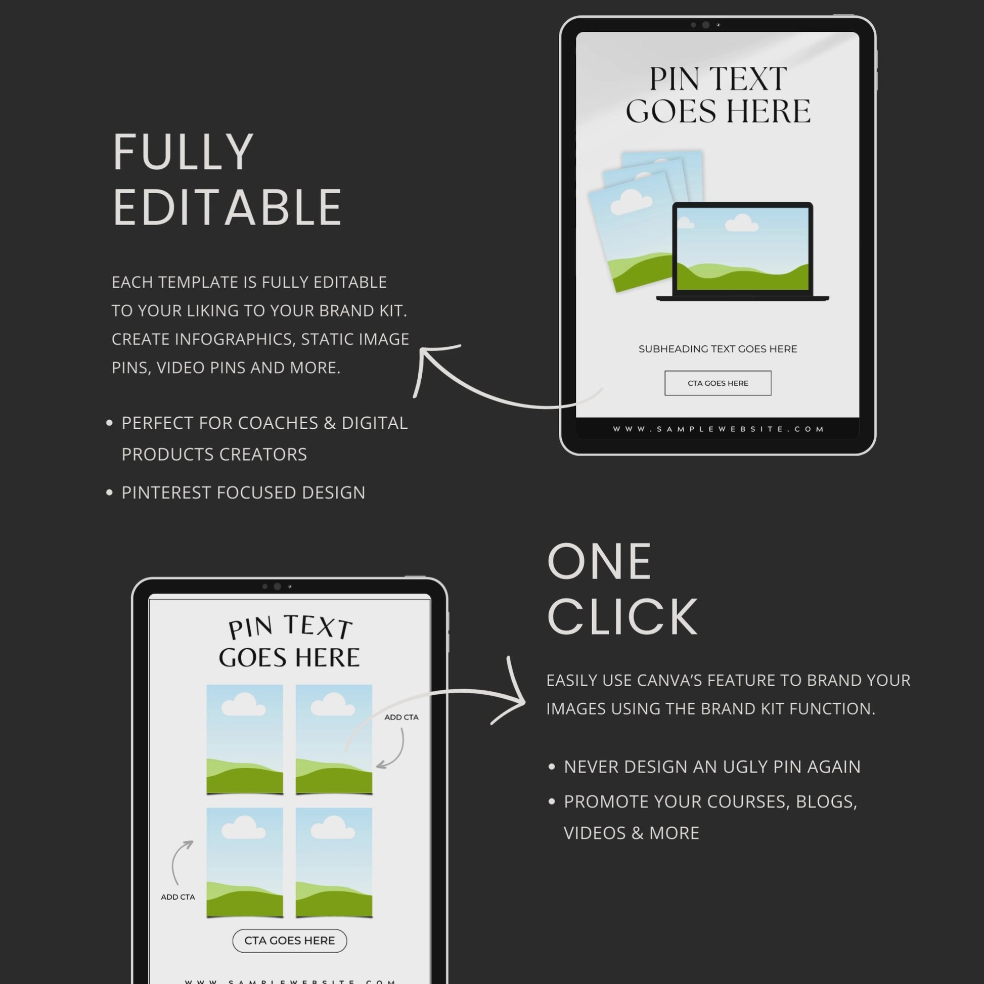 These Pinterest templates for Canva are fully editable and can be branded to your businesses with a click of a button.